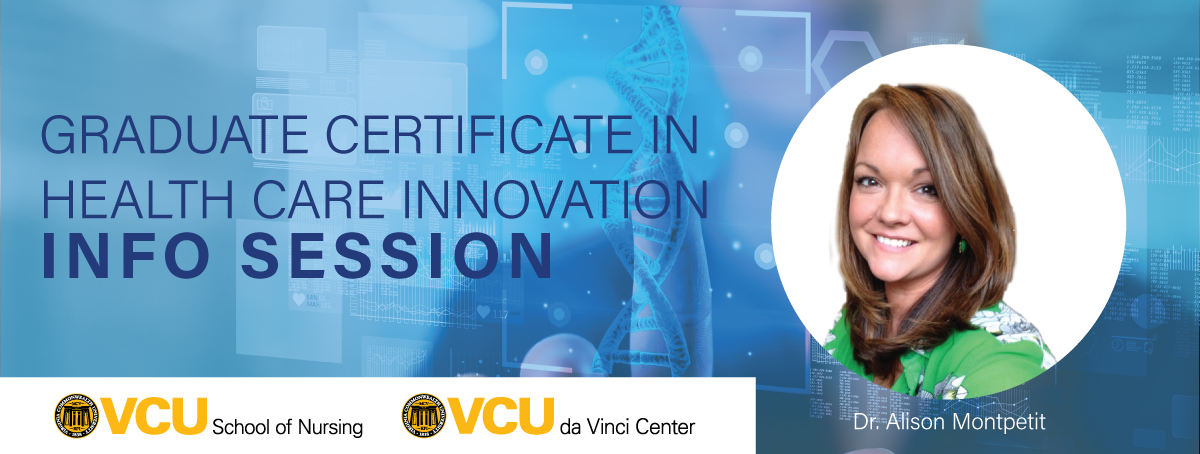 Join faculty and staff from the VCU School of Nursing and VCU da Vinci Center for Innovation to learn about the graduate certificate program for those with an interest in innovation to develop products and solutions to challenges facing the health care industry. The certificate will provide opportunities for students to advance their knowledge and skills at identifying problems and implementing solutions to foster high quality, safe and accessible health care. We will share some general information about the program and hold a Q&A with current student, Dr. Alison Montpetit.